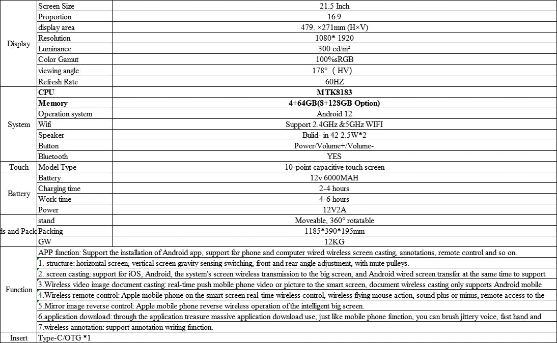 APP function: Support the installation of Android app, support for phone and computer wired wireless screen casting, annotations, remote control and so on. |